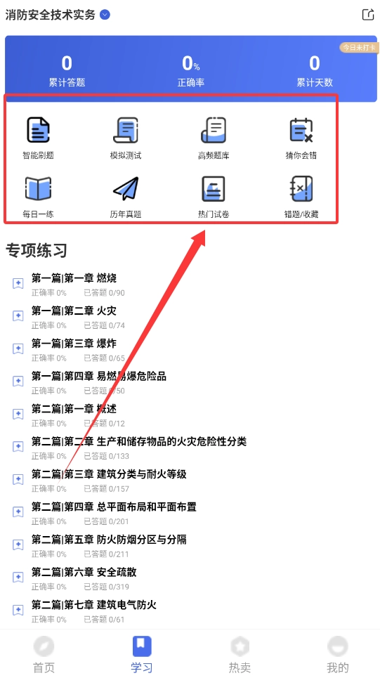3、点击底部导航栏切换至学习页面,该页面配备了智能刷题、模拟测试、专项练习等多样化学习功能,用户可根据自身需求灵活选用。