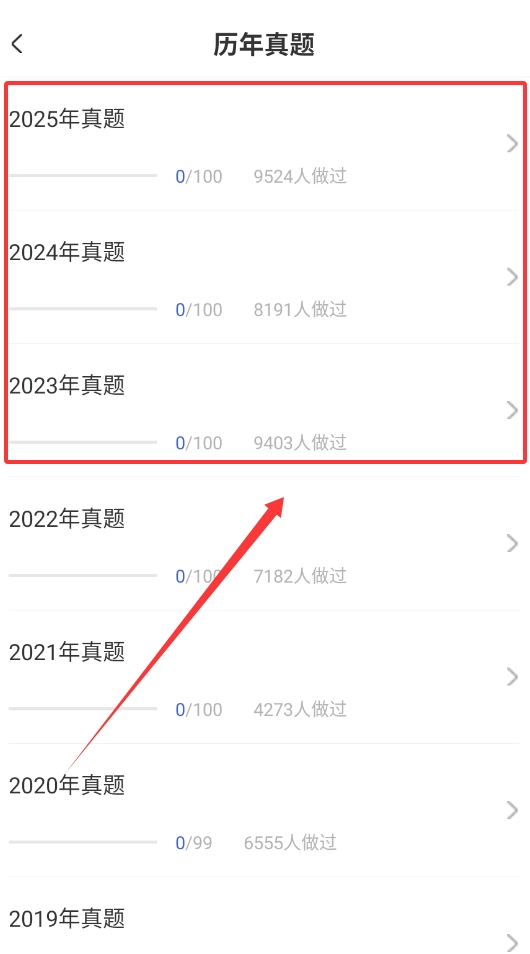 4、想练习真题的话,可以在学习页面找到历年真题模块,选择不同年份的真题进行练习,还能看到大家的做题数据作为参考。