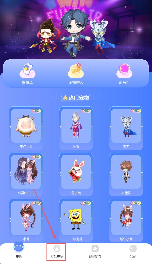 1、打开点击下方互动宠物选项进入宠物管理界面,浏览各种宠物功能操作选项。