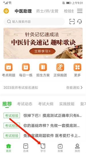 打开医学教育网,选择下方“学习”选项