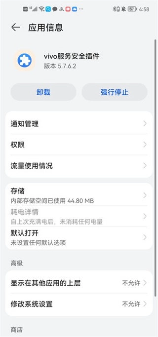 进入设置页面,依次点击“更多设置”-“应用程序”-“已安装”,在已安装列表里找到“vivo服务安全插件”,将其移动到系统空间即可。