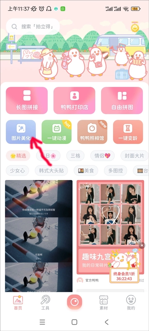 1、用户打开拼图鸭相机应用,进入首页界面,在这个页面能够开展长图拼接、自由拼图、图片美化等操作,接着点击图片美化功能。