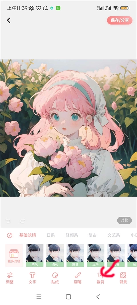 3、进入图片编辑界面后,用户可在底部工具栏里找到裁剪功能,点击打开该功能就能选择翻转选项。