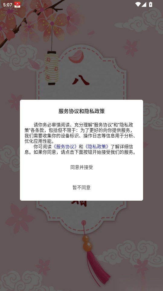 打开软件后阅读“服务协议和隐私政策”,点击“同意并接受”按钮即可进入。
