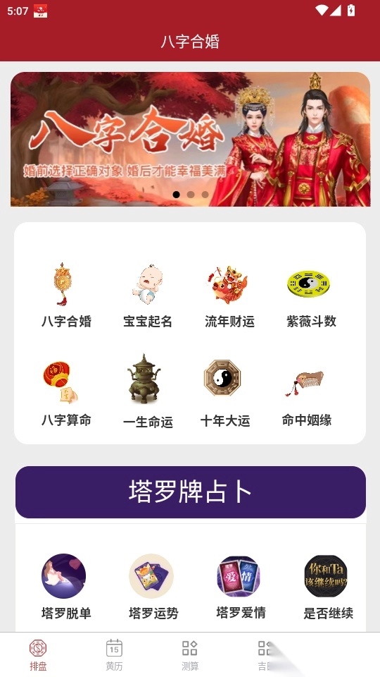 八字合婚免费版是一款集成了八字合婚、八字算命、宝宝起名、塔罗牌占卜等多种排盘测算功能的软件。用户可通过输入男女双方的生辰八字进行合婚测算,通过付费方式查看合婚结果,支持多种支付渠道,价格经济实惠,让用户轻松便捷地获取合婚测试结果。此外,软件还提供塔罗牌占卜、周公解梦等运势测算方式,方便用户随时掌握爱情、财富、事业等各方面的运势动态。同时,软件实用的黄历工具,用户可随时随地查询黄历宜忌信息,参考宜忌详情挑选吉日。有需求的用户不妨来体验八字合婚吧!