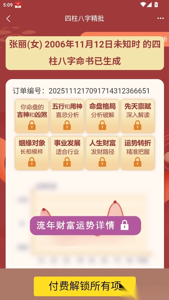 最后点击“付费解锁所有项”的功能按钮,就能查看你的八字算命结果了。