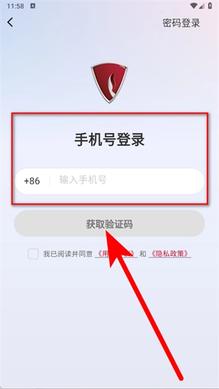 请先输入您的手机号码,接着勾选同意相关协议,最后点击“获取验证码”按钮即可。