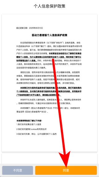 1、启动医动力患者版应用,在弹出的个人信息保护政策界面点击“同意”按钮。