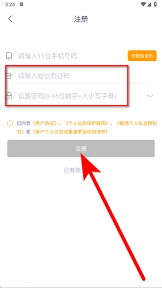 4、请输入您收到的短信验证码,接着设置一个符合要求的密码,勾选相关选项后,点击注册按钮,即可完成注册流程。