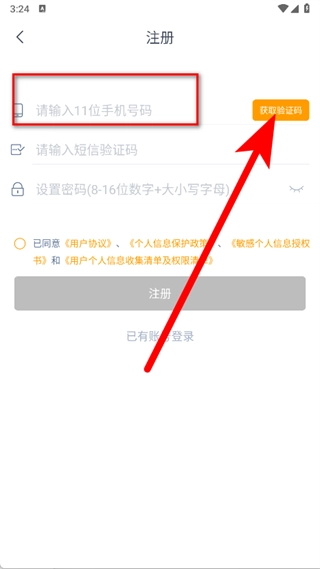 3、进入注册页面后,填写11位手机号码,接着点击“获取验证码”按钮。
