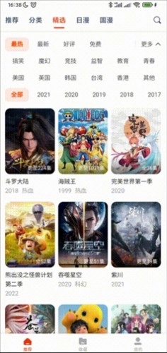 3、精选页面的分类更为细致,不仅包含冒险、剧情、科幻、热血等动漫类型分类,还设有动漫属地、年份等分类维度。