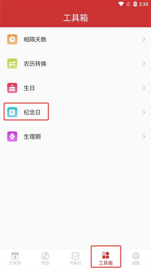1、打开软件后找到工具箱模块,该模块内包含多种实用小工具,从中选择“纪念日”工具。