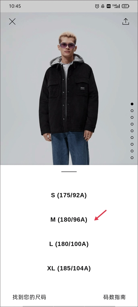 (3)页面弹出了几个衣服尺寸选项,你可依据自身实际情况挑选合适的衣服尺码。要是你对自己的尺码不太清楚,还能点击“码数指南”获取帮助。