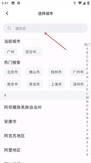 1、在主界面,点击顶部的城市区域,即可进入城市选择页面。