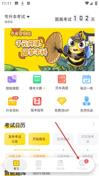 1、在专升本考试【练习】界面,点击底部【个人中心】选项,可进入对应的个人中心页面。