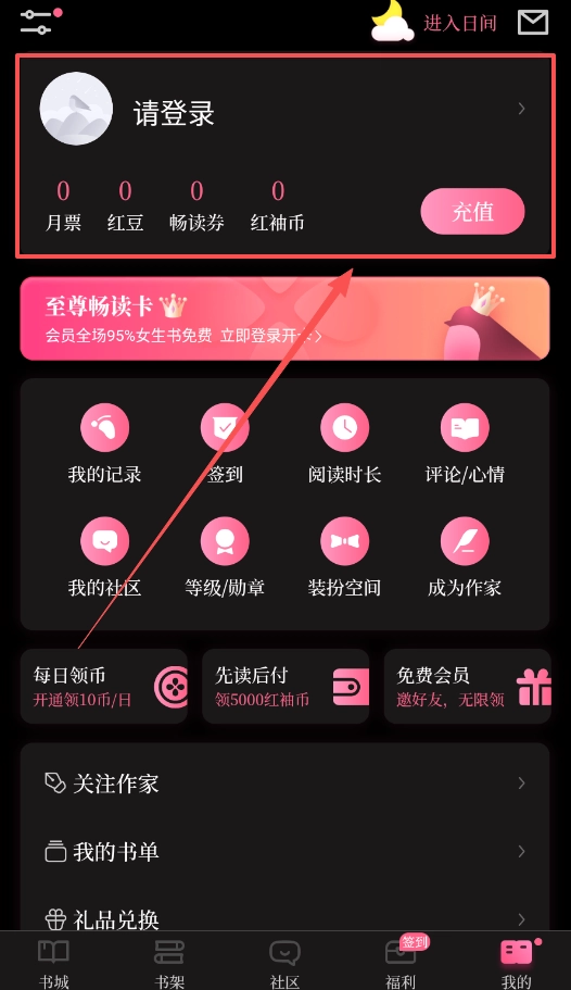 1、首次使用建议先完成账号登录,登录后在我的页面能看到签到、阅读时长和等级勋章等功能。
