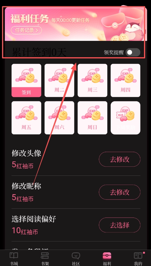 4、记得常去福利中心逛逛,那里提供每日领币、先读后付和邀请好友等多种活动,通过简单任务就能获取红袖币和免费阅读权限。