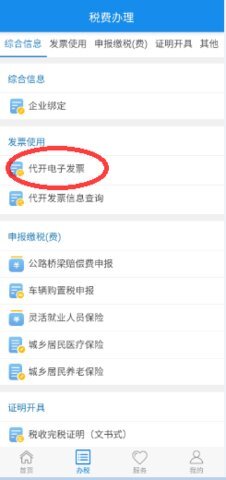 2. 在新弹出的页面里,挑选并点击办税功能下方的【代开电子发票】选项。