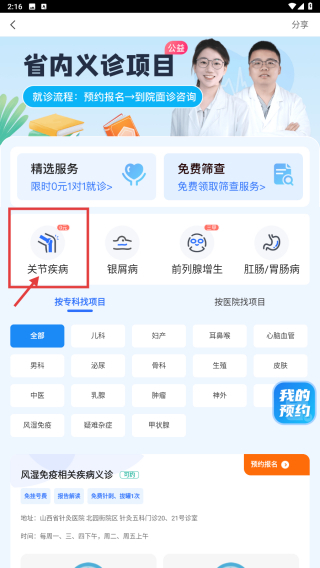 3、于项目列表里,点击关节疾病项目,进而进入骨关节炎与运动损伤义诊详情页面。