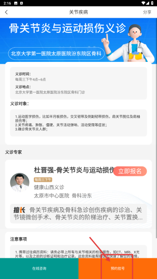 4、于义诊详情页面,点击预约挂号按钮,以完成义诊预约相关操作。