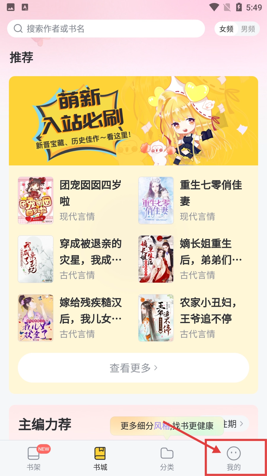 首页设有推荐小说板块与搜索功能,点击右下角的【我的】按钮即可进入个人页面。