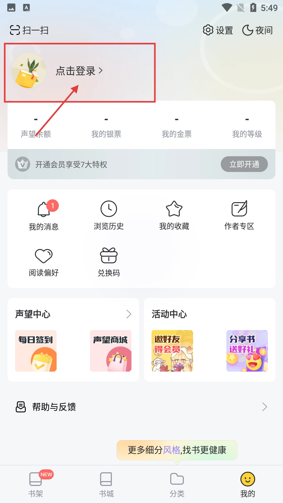 在【我的】页面中,找到并点击【点击登录】区域,即可进入登录流程。