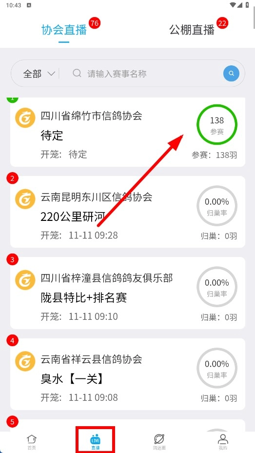 点击底部的【直播】功能按钮,进入直播页面后,就能看到像四川省绵竹市信鸽协会这类赛事的直播信息了。