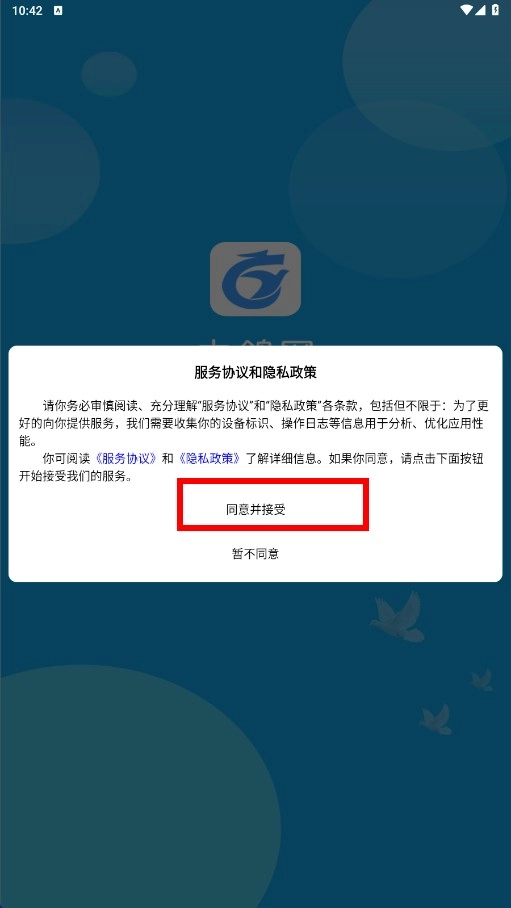 点击【同意并接受】功能按钮,在同意服务协议与隐私政策后即可进入应用。