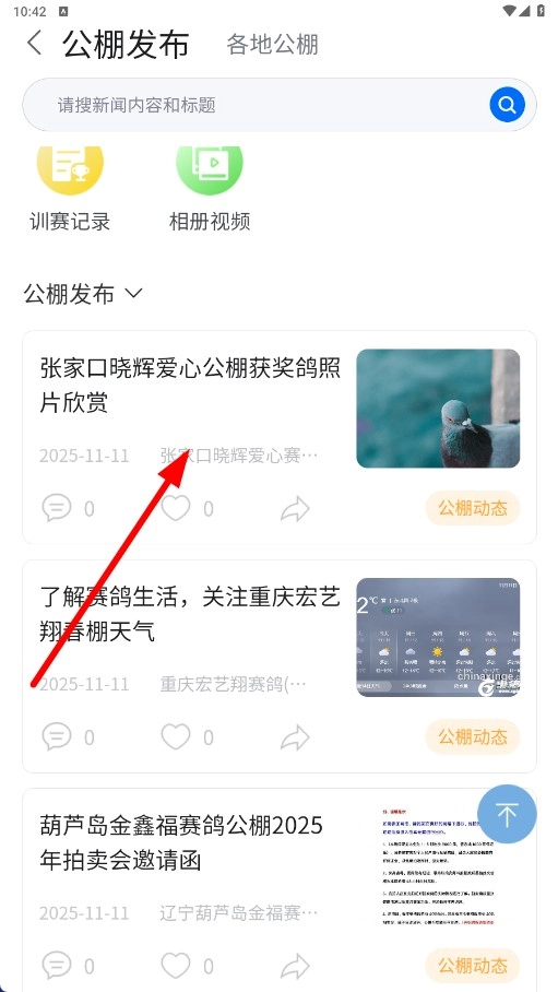 在公棚发布页面,能够查看像【张家口晓辉爱心公棚获奖鸽照片欣赏-公棚动态】这类内容。