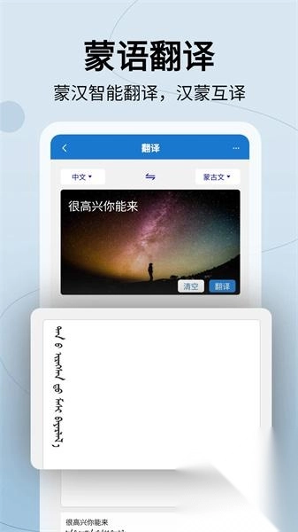 蒙汉翻译通是一款专注于汉语与蒙古语互译的语言翻译应用。它提供了文字、语音、照片等多种翻译形式,能为用户带来全方位的翻译体验。同时,应用内收录了大量汉蒙双语例句,方便用户参考学习语言。另外,平台还配备了专业的人工翻译服务,由蒙古语母语者及蒙文专业领域的专家提供翻译支持。