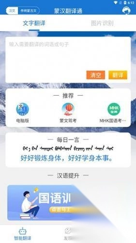 进入主页后,能看到文字翻译与图片识别两大功能板块,同时还设有电脑版推荐、蒙文驾考、MHK国语考试宝典等实用工具,此外每日一言、汉语提升等特色内容也一应俱全。
