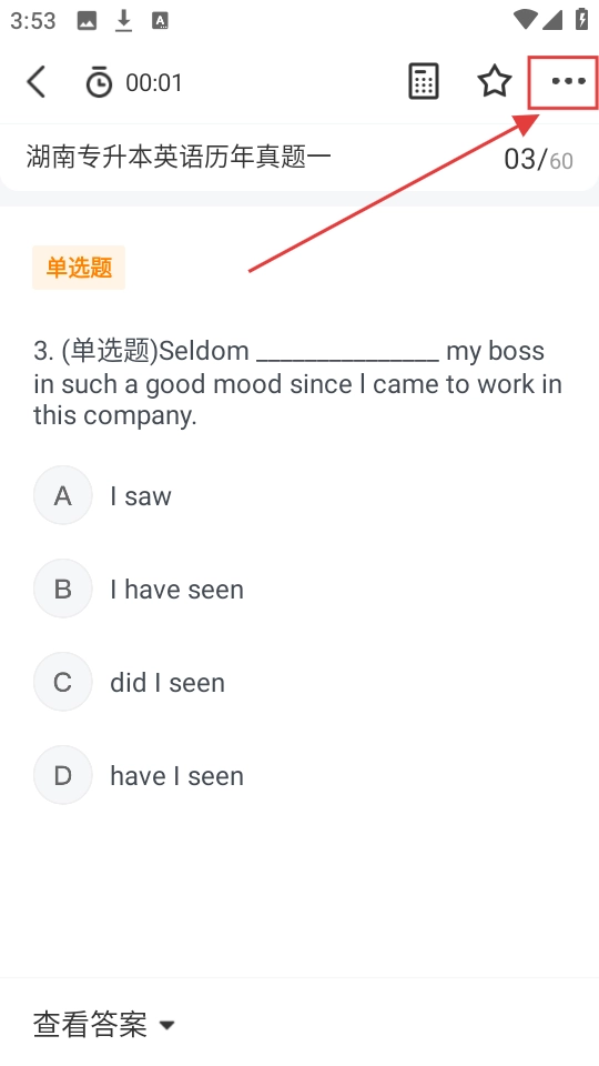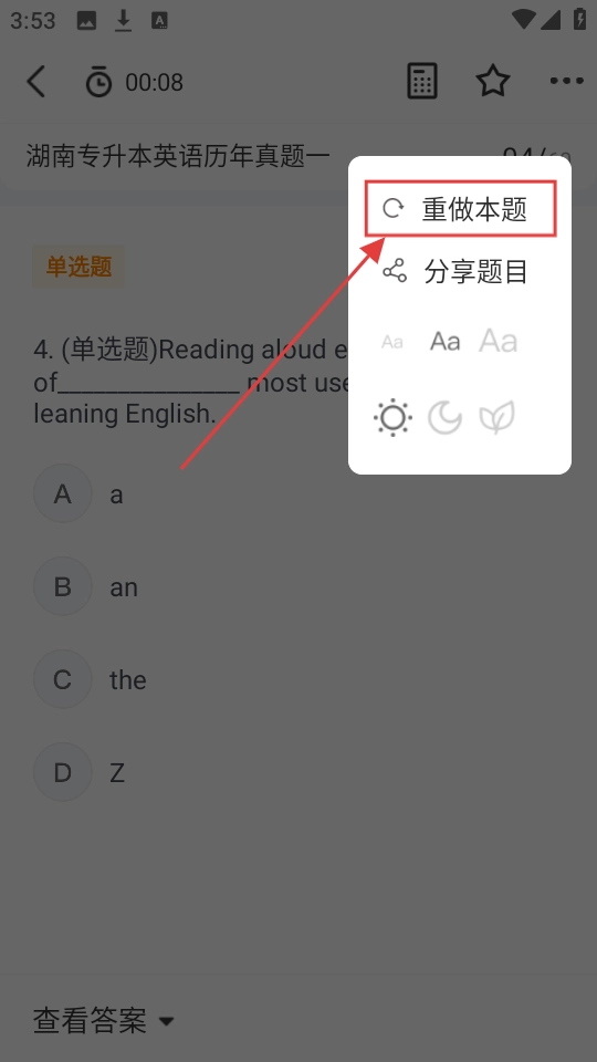 做题时,要是想重新做题目或者分享题目,点击右上角的【···】按钮,就能调出功能选项了。