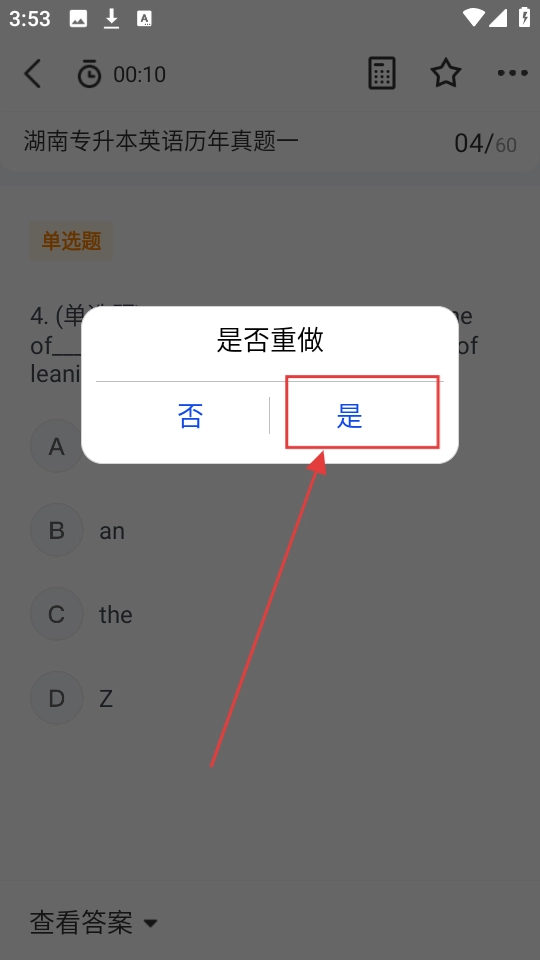 确认选择重做后,系统会带您回到当前题目重新开始作答,这样您就能再次思考并选择答案,从而进一步加深对相关知识点的理解与掌握。