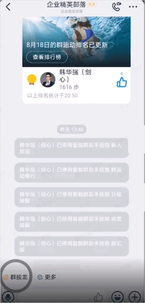 1、【手机端钉钉】-【消息】-需要点击聊天框上方的【群接龙】