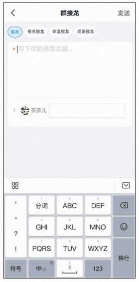 2、选择【接龙/报名接龙/体温接龙/成语接龙】-【输入接龙主题】-【发送】即可。