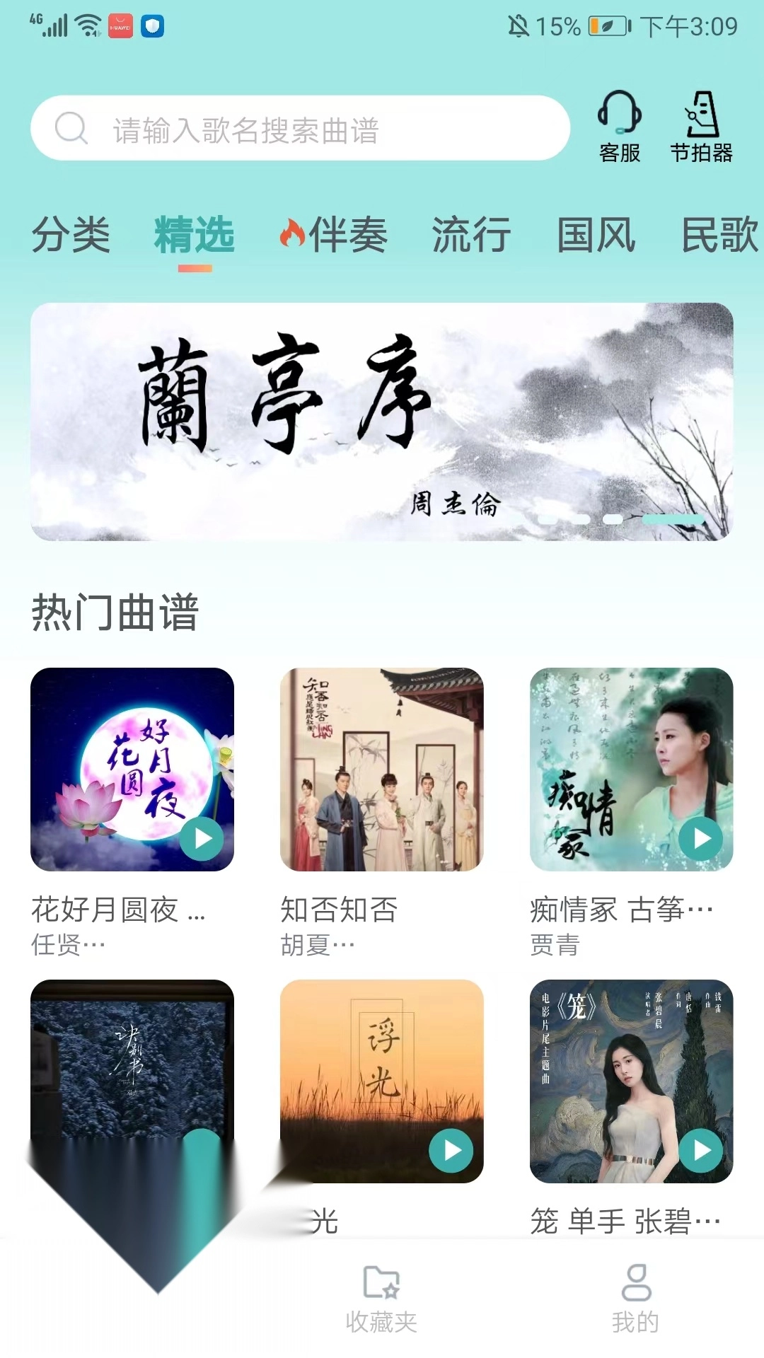 1、打开古筝世界,进入应用界面,可看到包括分类、精选、伴奏、流行、国风和民歌等音乐类别,用户可根据喜好选择相应的类别,