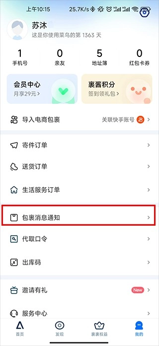 3、打开我的之后,点击包裹消息通知