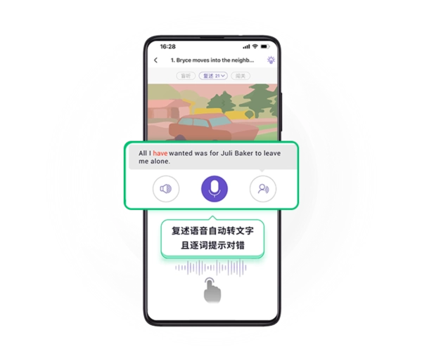 【专利设计】:盲听时字幕单词分级隐藏和复述后的分步逐词提示,凸显每一个潜藏的“听说”隐患,让训练更精准有效。