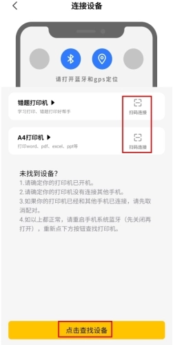 2、在连接设备页面中打开扫描工具,直接扫描二维码;或者自己查找设备连接。