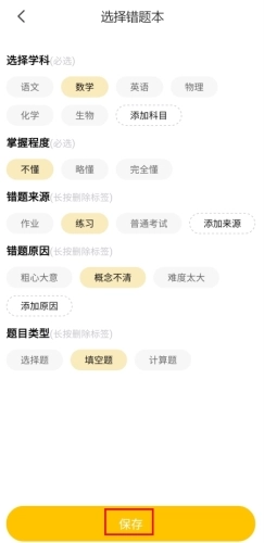 2、选择该错题的学科、类型、来源等等,点击下方的保存按钮就能够保存了。