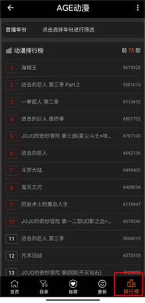 5、排行榜页面:会将每一年的前75部动漫进行排列。