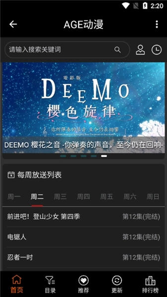 1、首页页面:会进行每周放送,可以查看到每天的动漫更新情况;