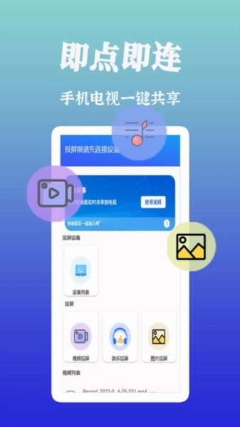 -视频投屏:自动扫描本地视频文件,多种格式文件支持。智能解码播放,一键投屏。