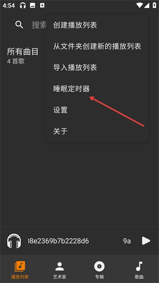 2、在下拉菜单里,点击【睡眠定时器】这一选项,即可进入定时时长的选择页面。