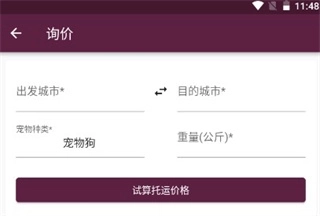 4、输入出发城市与目的城市,填写宠物的种类及重量,即可试算托运价格。