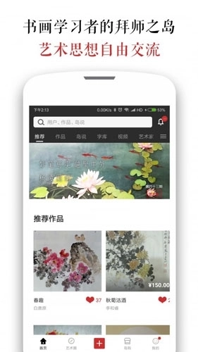3、墨客岛,书画艺术爱好者、学生拜师学艺的互动平台;艺术成果展示、原创作品拍卖及艺术思想交流的传播平台。