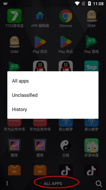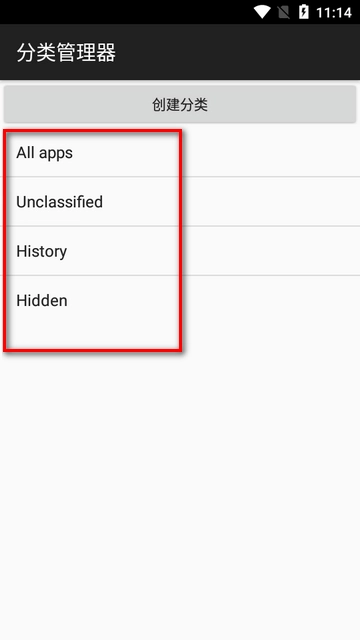 3、点击中间的按钮,即可查看所有app、历史已开启的app以及未分类的app。