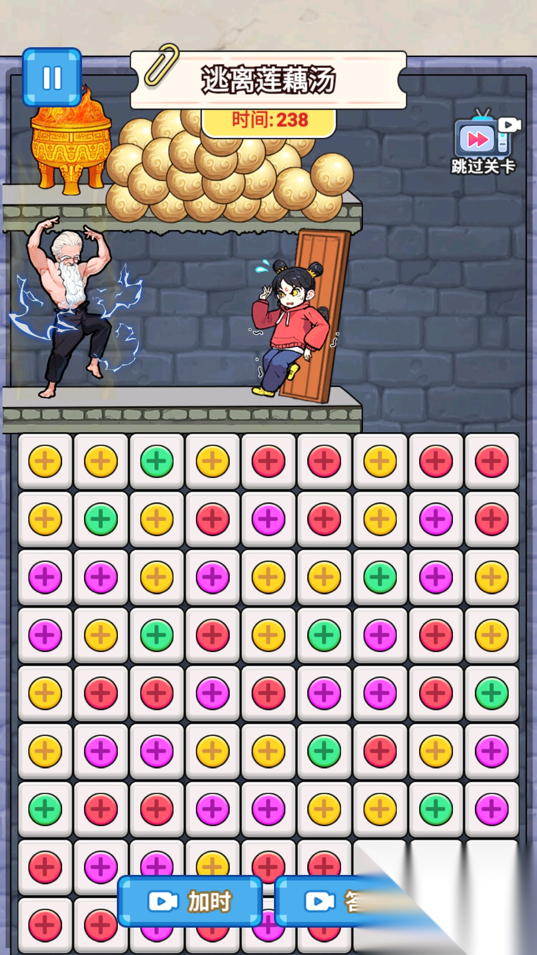 2、点击消除关键方块,使其他方块掉落,让金丹砸向坏人,为小女孩争取逃生时间。
