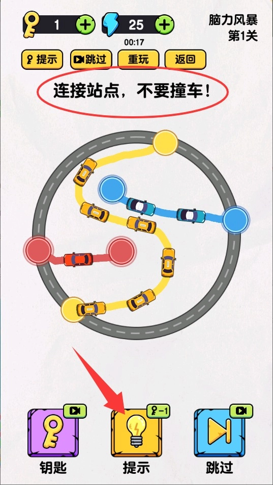 2、用手指滑动屏幕将相邻的站点连成线,注意观察顶部任务栏的目标要求,同时底部会实时显示操作技巧提示。