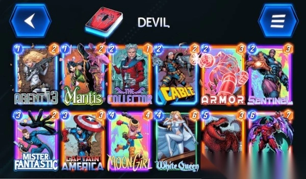 中文卡表包含:13号特工、曼蒂斯、收藏家、电索、凯、哨兵、神奇先生、美国队长、月亮女孩、白皇后、恶魔恐龙、狂攻